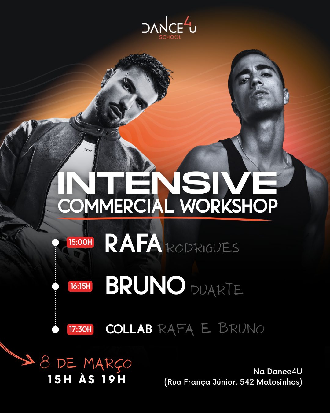 Os bailarinos internacionais Rafa Rodrigues e Bruno Duarte vão estar na Dance4U para um mega workshop de commercial.